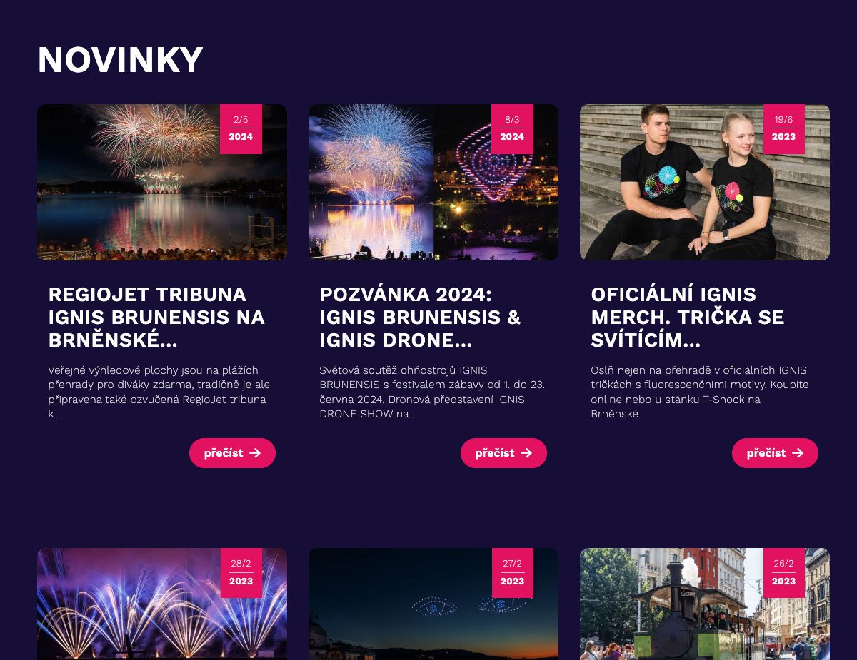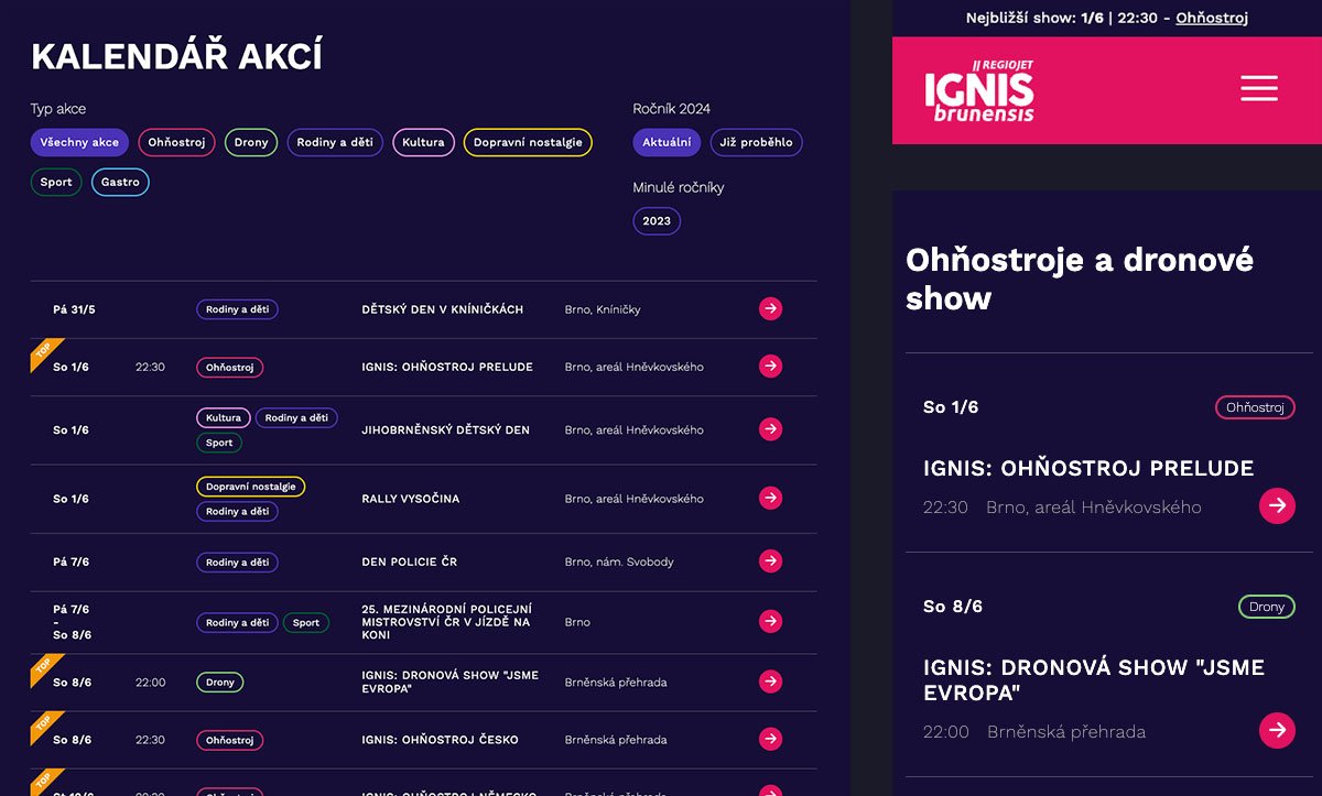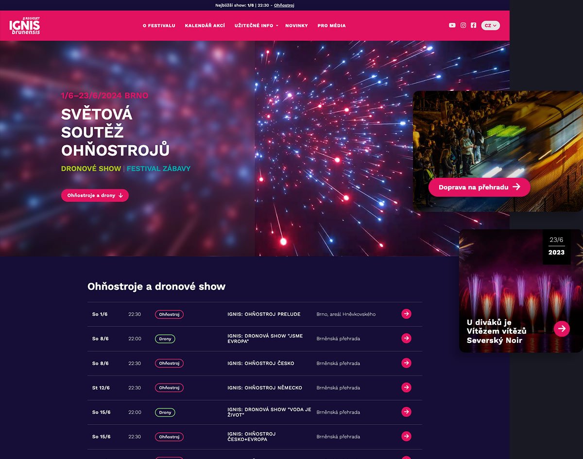 Nejbližší show je navíc promována v horní liště nad menu a ohňostroje a dronové show zabírají jako nejdůležitější typ akcí samostatný blok na homepage.