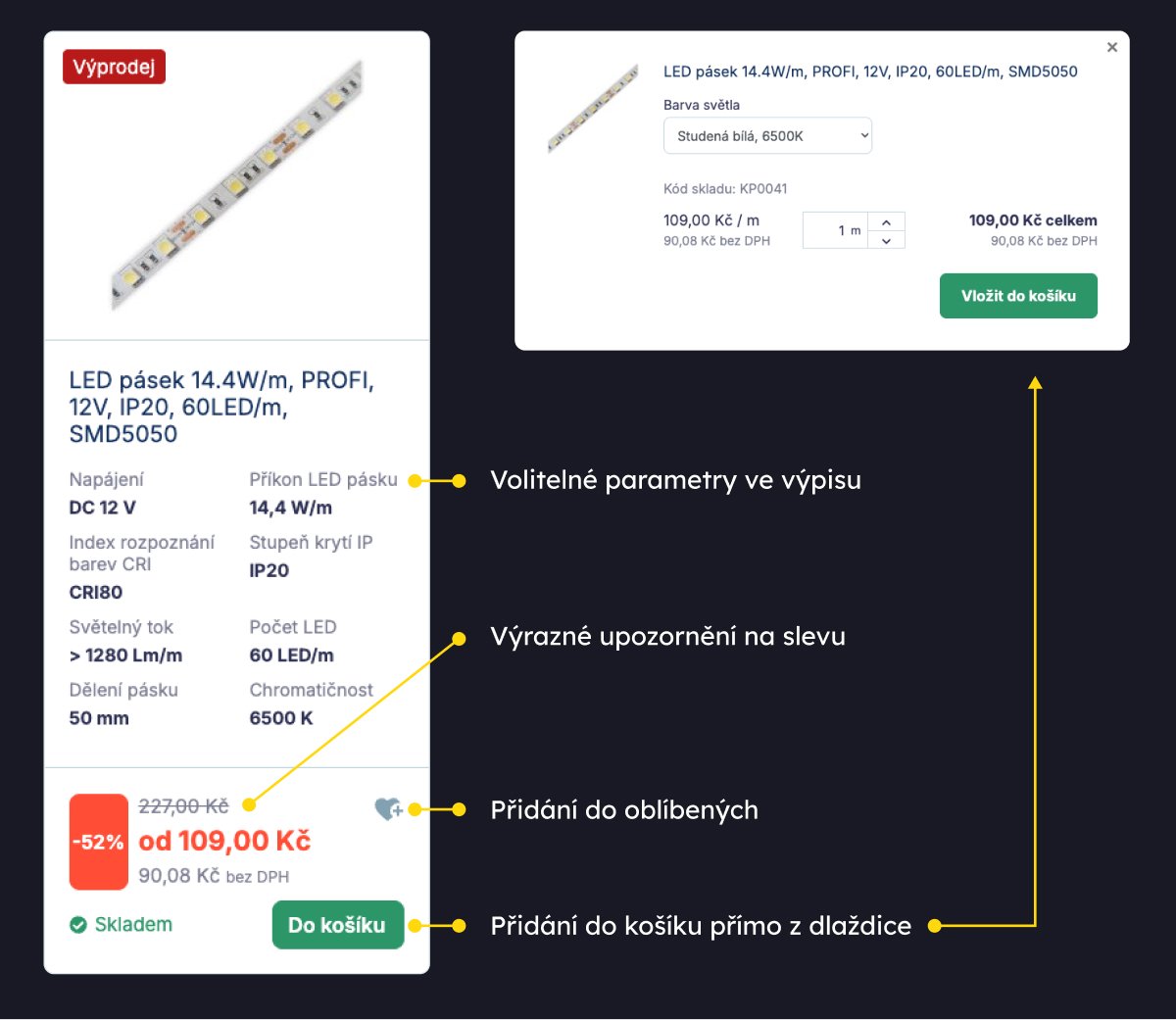 Všechno důležité jsme vměstnali do horní části stránky. Tak, aby zákazníci nemuseli scrollovat pro vložení zboží do košíku.