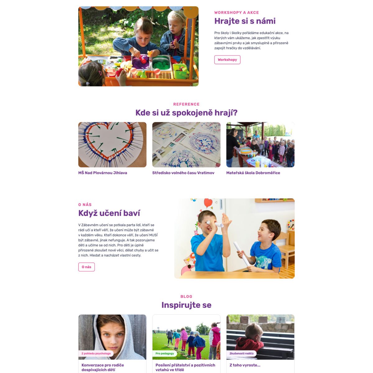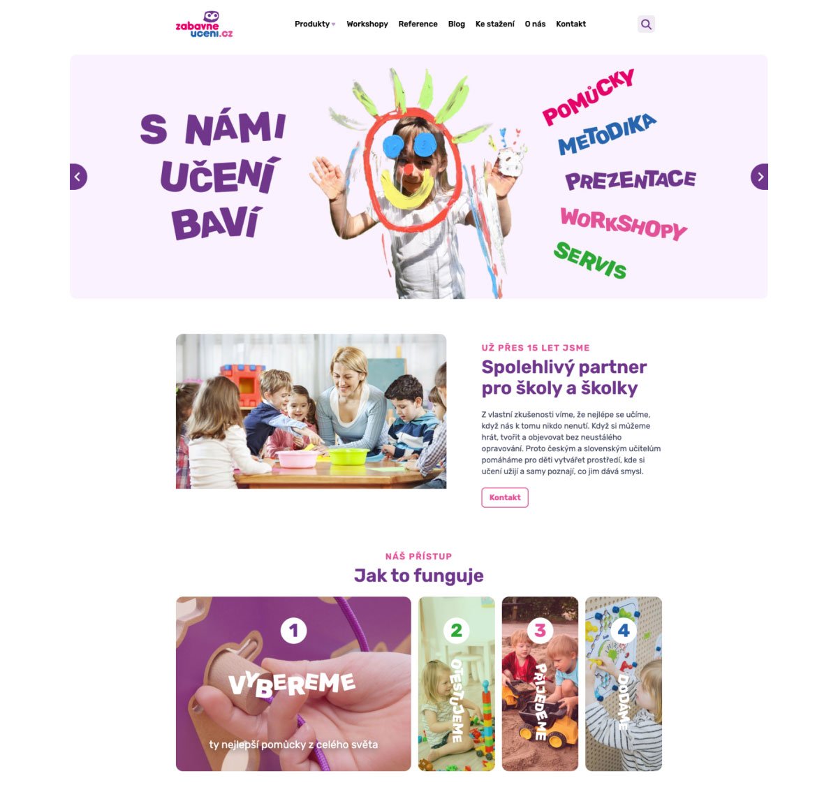 Princip Zábavného učení by měl každý pochopit už z homepage. Prezentujeme tam jak fungování firmy, tak i hlavní doplňkové služby jako workshopy nebo blog s praktickými radami.