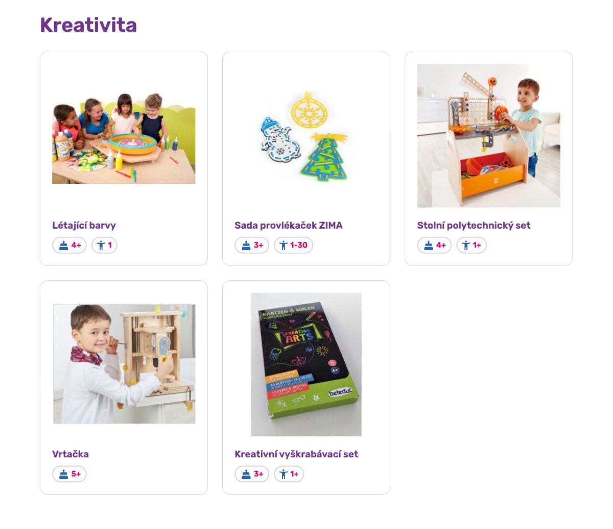 Pro přehlednost jsme produkty rozdělili do kategorií a přidali k nim parametry jako věk nebo počet hráčů.
